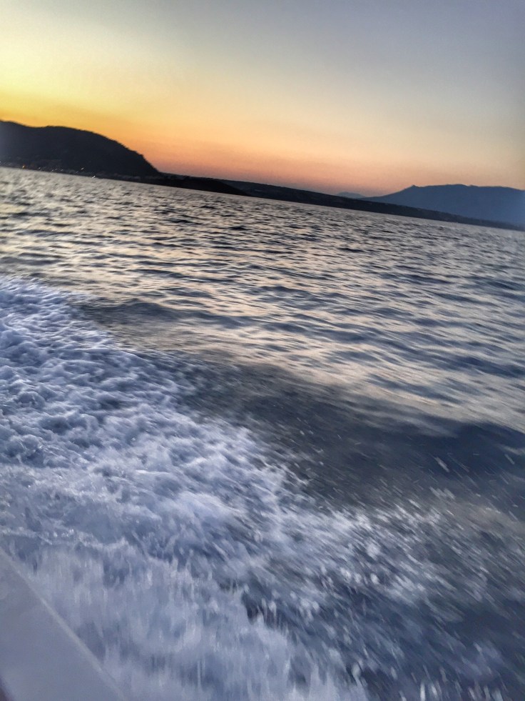 Το θέαμα που αντικρίζω είναι απαράμιλλης ομορφιάς! Τα πορτοκαλοκόκκινα χρώματα του ουρανού σε συνδιασμό με το σκούρο μπλέ της θάλασσας και το ελαφρώς δροσερό αεράκι που μας συντροφεύει φέρνουν ένα ανεπαίσθητο χαμόγελο στο πρόσωπο μου. Ίσως είναι η αναπάντεχη ευτυχία που με επισκέφτηκε και είχα τόση ανάγκη! Μέσα σ’ αυτό το σκαφάκι, εκείνο το βραδυ του Σαββάτου νομίζω υπήρχε τόση αγάπη και τόση χαρά που έφτανε και περίσσευε για να την πάρω μαζί μου και στον γυρισμό μου στην Αθήνα!